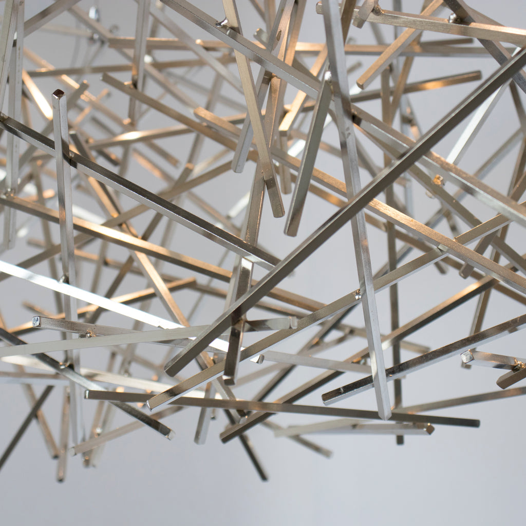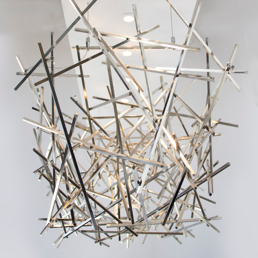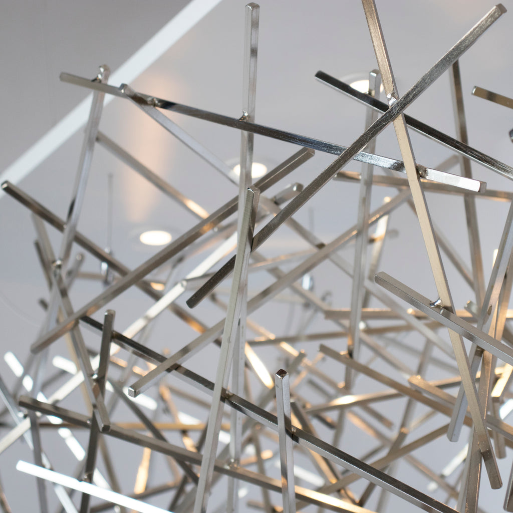 The CRISS-CROSS series was created from a genuine desire to blend art with lighting. It is a sculptural piece that is composed of cut steel rod, carefully arranged and welded in a seemingly random pattern. The CRISS-CROSS Chandelier is lit from a canopy mounted above the sculpture. The suspension cables can be adjusted on-site to have the sculpture float below the canopy to any desired height.