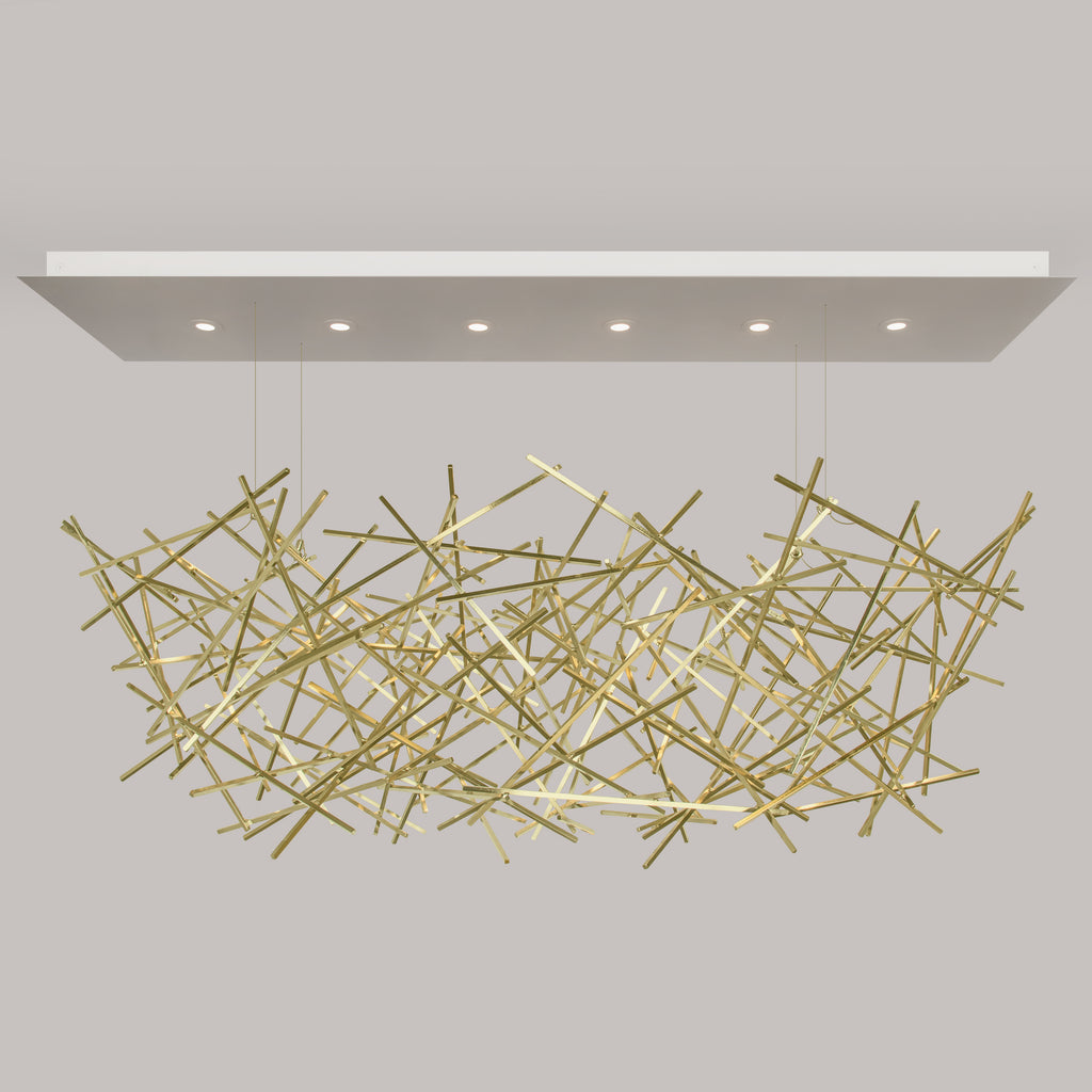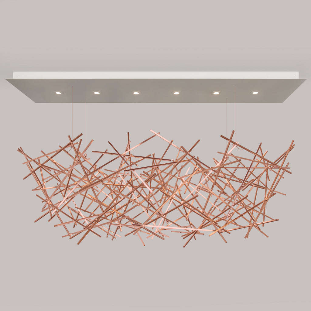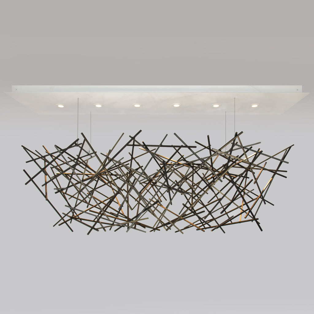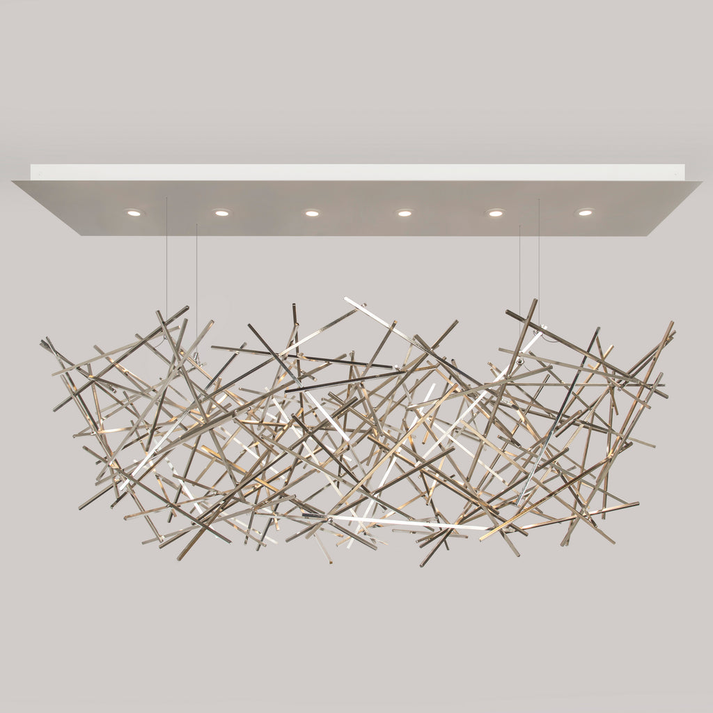 The CRISS-CROSS series was created from a genuine desire to blend art with lighting. It is a sculptural piece that is composed of cut steel rod, carefully arranged and welded in a seemingly random pattern. The CRISS-CROSS Chandelier is lit from a canopy mounted above the sculpture. The suspension cables can be adjusted on-site to have the sculpture float below the canopy to any desired height.