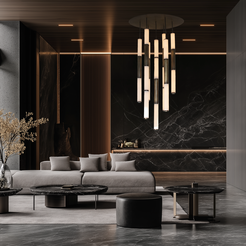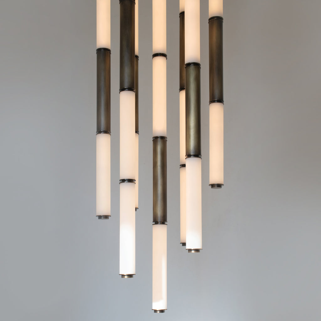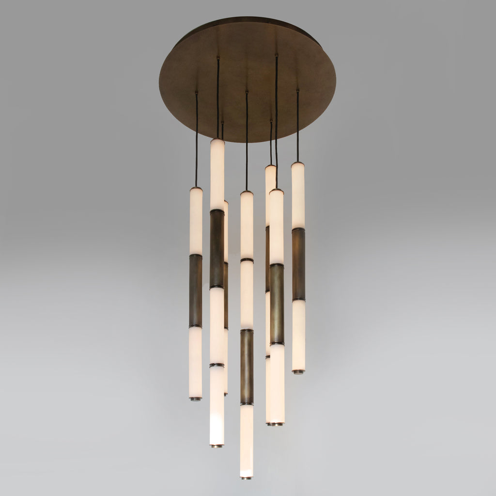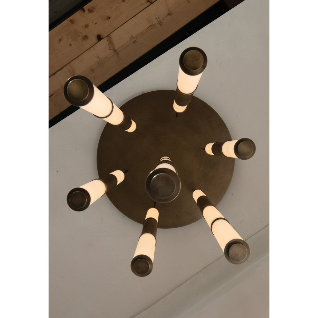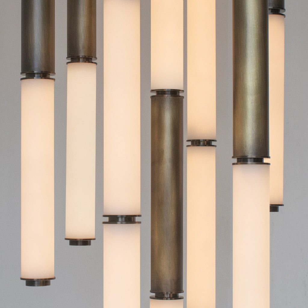 Elevate your space with the remarkable SCEPTER 7 Chandelier. Adorned with suspended groupings of glass and brass cylindrical elements, this elegant fixture emits a cozy glow that cascades like a gentle rainfall.